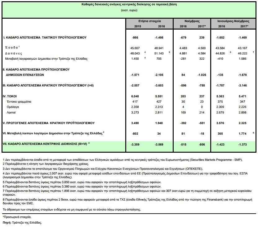 Κατά την περίοδο αυτή, τα έσοδα του τακτικού προϋπολογισμού διαμορφώθηκαν σε 43.167 εκατ. ευρώ, από 43.584 εκατ. ευρώ πέρυσι. Όσον αφορά τις δαπάνες του τακτικού προϋπολογισμού, στις οποίες περιλαμβάνονται και δαπάνες ύψους περίπου 1.896 εκατ. ευρώ που αφορούν την αποπληρωμή ληξιπρόθεσμων οφειλών (έναντι 3.380 εκατ. ευρώ πέρυσι), αυτές διαμορφώθηκαν σε 46.222 εκατ. ευρώ, από 44.826 εκατ. ευρώ την περίοδο Ιανουαρίου-Νοεμβρίου 2016.