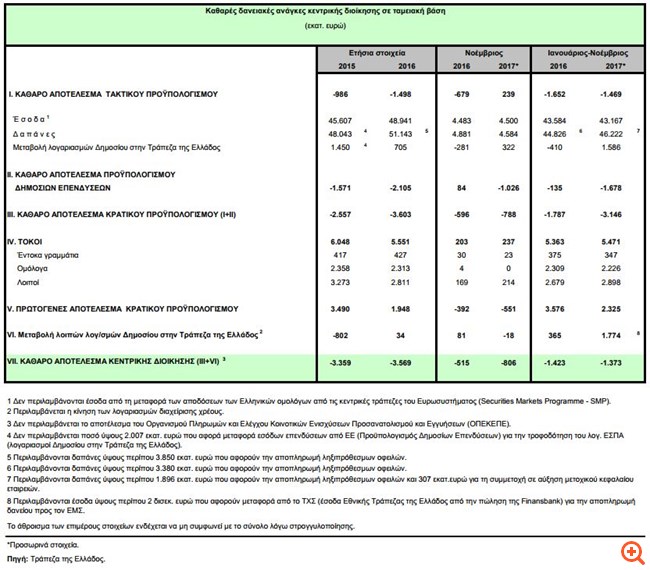 Έλλειμμα ύψους 1.373 εκατ. ευρώ παρουσίασε την περίοδο Ιανουαρίου-Νοεμβρίου 2017 το ταμειακό αποτέλεσμα της κεντρικής διοίκησης, έναντι ελλείμματος 1.423 εκατ. ευρώ την αντίστοιχη περίοδο του 2016, σύμφωνα με τα προσωρινά στοιχεία της Τράπεζας της Ελλάδας.