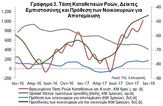 Στο Γράφημα 3 παρουσιάζονται οι παράγοντες που οδηγούν στην ανοδική τάση της βραχυχρόνιας τάσεως των ροών καταθέσεων, η οποία προσεγγίζεται με τον κινητό μέσο 6 μηνών (κόκκινη γραμμή). Μελετώντας το Γράφημα 3, μπορούμε να παρατηρήσουμε ότι η αυξητική τάση των ροών καταθέσεων συνδέεται σε μεγάλο βαθμό με την ανάκτηση της εμπιστοσύνης και τη σταδιακή επιστροφή στο τραπεζικό σύστημα μέρους των υπολοίπων που είχαν αποθησαυριστεί ή διοχετευθεί στο εξωτερικό.