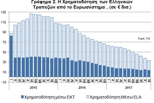 Η αποκατάσταση της εμπιστοσύνης στην οικονομία και το τραπεζικό σύστημα αντανακλάται επίσης στη μείωση της εξαρτήσεως των ελληνικών χρηματοπιστωτικών ιδρυμάτων από τον μηχανισμό χρηματοδοτήσεως του Ευρωσυστήματος (ΕKT και ELA) για έκτακτη ρευστότητα. Συγκεκριμένα, η χρηματοδότηση μειώθηκε σταδιακά το 2017, με αποτέλεσμα τον Δεκέμβριο να διαμορφωθεί σε €33,7 δισ., από €66,6 δισ. τον Δεκέμβριο του 2016 (Γράφημα 2).