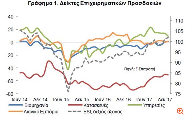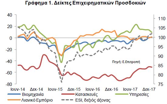 Σύμφωνα με τα στοιχεία της Ευρωπαϊκής Επιτροπής, ο γενικός Δείκτης Οικονομικού Κλίματος (ESI) στην Ελλάδα συνεχίζει να βελτιώνεται τον Ιανουάριο του 2018, στις 101,9 μονάδες, από 101,3 μονάδες τον Δεκέμβριο του 2017 και 95,3 μονάδες τον περυσινό Ιανουάριο, με αποτέλεσμα να διατηρείται για δεύτερο συνεχή μήνα σε επίπεδο υψηλότερο έναντι του μακροχρόνιου μέσου όρου της ΕΕ28 (100). Η βελτίωση του γενικού δείκτη αποδίδεται κυρίως στην ενίσχυση του δείκτη επιχειρηματικών προσδοκιών στη βιομηχανία, με το ισοζύγιο θετικών/αρνητικών απαντήσεων να είναι σε θετικό έδαφος για δεύτερο συνεχή μήνα και τη βελτίωση του δείκτη επιχειρηματικών προσδοκιών στο λιανικό εμπόριο (Γράφημα 1).