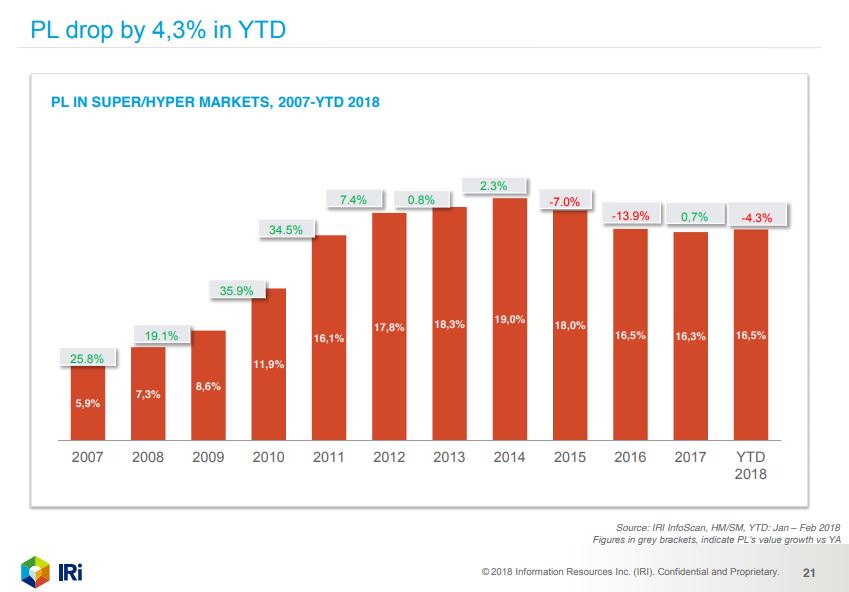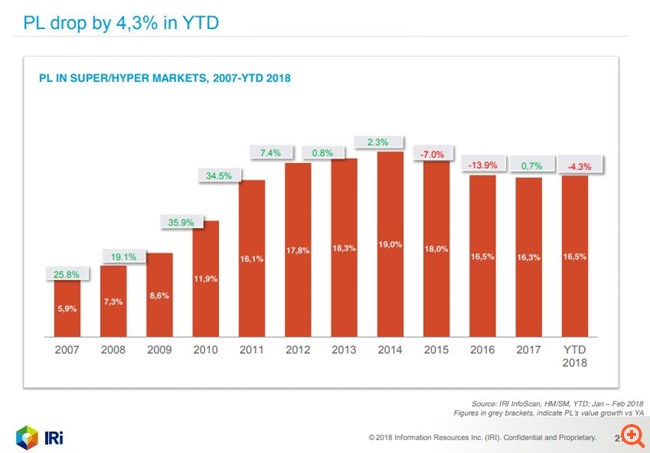 Η ουσία είναι ότι τα προϊόντα ιδιωτικής ετικέτας στην Ελλάδα συνεχίζουν να δέχονται ισχυρές πιέσεις. Η πρόσφατη έρευνα της IRI για την πορεία της κατανάλωσης το πρώτο δίμηνο της φετινής χρονιάς, σε σχέση με το αντίστοιχο διάστημα έναν χρόνο πριν, έδειξε πως οι πωλήσεις των προϊόντων ιδιωτικής ετικέτας σημείωσαν νέα υποχώρηση 4,3%, όταν συνολικά ο τζίρος στο οργανωμένο λιανεμπόριο εμφάνισε οριακή πτώση 0,2%.